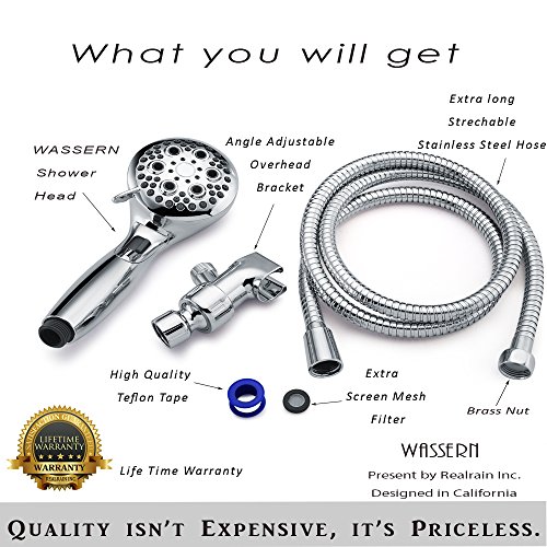 WHAT YOU GET: stunning gift box, Handheld Shower • Shower Hose with two washers • Overhead Bracket ( one washer already installed ) • Free Teflon Tape, Additional Water Filter • flow restrictor that is easy to install and remove. Installation Manual and Warranty. BEST LIFETIME WARRANTY: Hassle-Free US Limited Lifetime Warranty with LIVE customer service representatives in US.