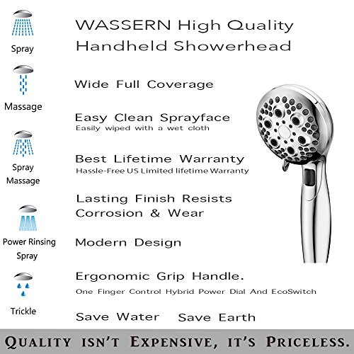 SAVING WATER SAVING MONEY: Saving $130/year or 40% water with our Patent Power Rinsing Spray Intake Air, Ecoswitch sprays and water saving trickle dial.The Wassern Showerhead will pay for itself in less than 3 month. INSTALL in minutes on any standard shower arm. Easy Tool-Free connection.