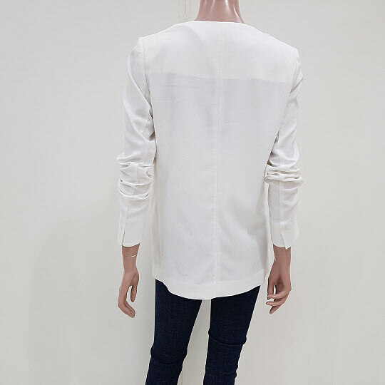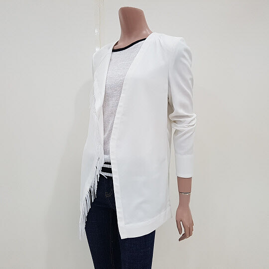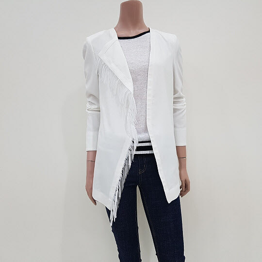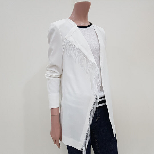 오른쪽 카라에 수술장식이 배색된 루즈핏 자켓입니다.여밈 없이 가볍게 걸치기 좋은 디자인입니다.