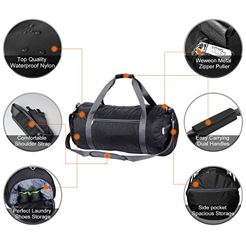-. Feature : ★GYM BAG VERY WELL DESIGNED BY WEWEON with 23x12x12 inches is a convenient choice for your everyday activities, travel, overnight, sports, gym, weekend and vacation. / ★SPORTS DUFFLE BAG MADE BY DURABLE AND HIGH QUALITY Ripstop Technology and Water resistant nylon keeps sports gear dry. Adjustable & Detachable Padded Shoulder Strap for comfort and Dual Handles for easy carrying on. / ★TRAVEL GEAR BAG FAST PACKED AND EASY CARRY ON. Foldable lightweight travel sport duffle bag save space and avoid the lage surcharge. Folds up into its own compact zippered pouch for storage. When folded just throw into your wardrobe, suitcase, handbag or car it takes up very little room and it can be used as an extra carry on to avoid the lage surcharge. / ★PLENTY ROOM GYM BAG WITH WET SHOE POCKET FOR MEN AND WOMEN! Finished interior seams for durability.Two spacious exterior zipper pockets for easy access and one mesh interior slip pocket for your smaller items. Front zippered organization pocket for storage clothing, shoes, toiletries, readings, iPad / tablet and personal items. Ventilated shoe storage compartment for 2 sets 14" shoes. Interior organization compartment with Big Mesh interior for carry your sports gear. / ★100% SATISFACTION GUARANTEED: This gym bag best delivery services ONLY fulfilled by Amazon and seller "WEWEON"store.If offered by other sellers in this listing will be different item.We stand behind our best gym bag.If you are not completely satisfied our selling gym bag,we will give you a full refund,zero questions asked.All rights reserved.