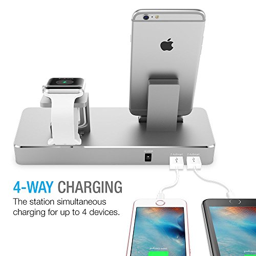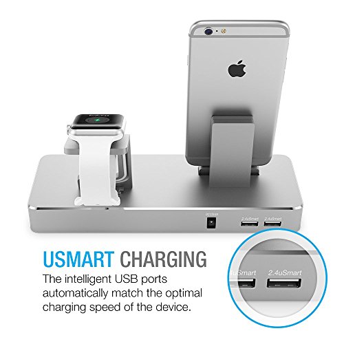 -. Feature : ALL IN ONE SOLUTION - Charge up to 4 devices including your apple watch from the CX Station. Perfect for charging and docking on your office desk, bed side or anywhere that you need to power through multiple different devices. / MOST POWERFUL CHARGING STATION- Equipped with 2x uSmart 2.4A USB ports, Apple Watch Stand and Cable Management Storage, and Built-in Apple Certified iPhone and iPad dock, can simultaneous charge up to 4 devices. / APPLE CERTIFIED - The charging station includes an Apple 8-Pin lightning dock setup. Compatible with All generation of iPhones and iPads as long as you can dock them. *Charge through the USB port requires additional cables that sold separately. / NEXT GENERATION DESIGN - Aluminum body makes the CX charging station like an art piece with an design from next century which can also easily blend into any of your in-house Apple computers and hardwares. / APPLE WATCH - Easily dock and charge your Apple watch and hide your Apple Watch charging cable within the charging station for a clean and neat setup. Special Note - No Apple watch charging cable is included, please use the stock cable.