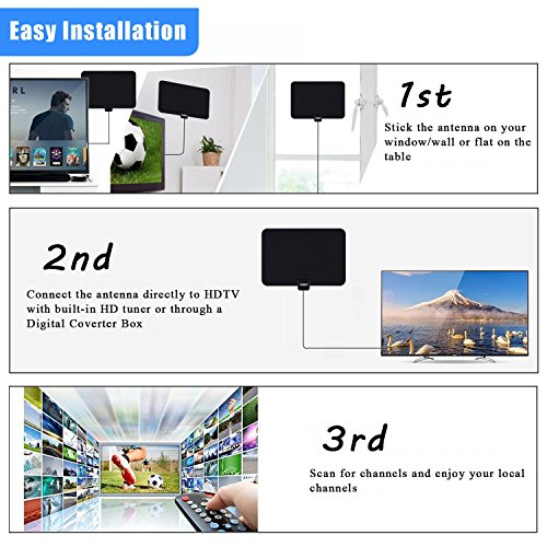 Choose The Right Indoor Digital TV Antenna for your area There are many specification for Antenna TV, 35miles and 50miles. Follows is the date for various specification's working range 35miles tv antenna:works best for 30-40miles local DTV station The link: www.amazon.com/dp/B01LXVRO6Y 50miles tv antenna:works best for 40-50miles local DTV station The link: www.amazon.com/dp/B01M0T7MFX www.amazon.com/dp/B01LLJNCEE How to fix the metters If there is no signal or clear picture,you can remove the amplifier and hang the receiver a little higher to the window and have a try,remenber to re-scan for channels after each moving As the large difference of the signal and surrounding,we have no choice but have one more try,please understand,but feel free to the reception and quality of the antenna. Warranty:one Year Warranty If you don't satisfied with the channels you get, please DO contact us. We will take care of your issue immediately and help you solve any problems you come across while using our antenna.Feature