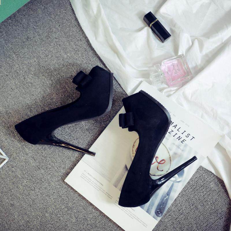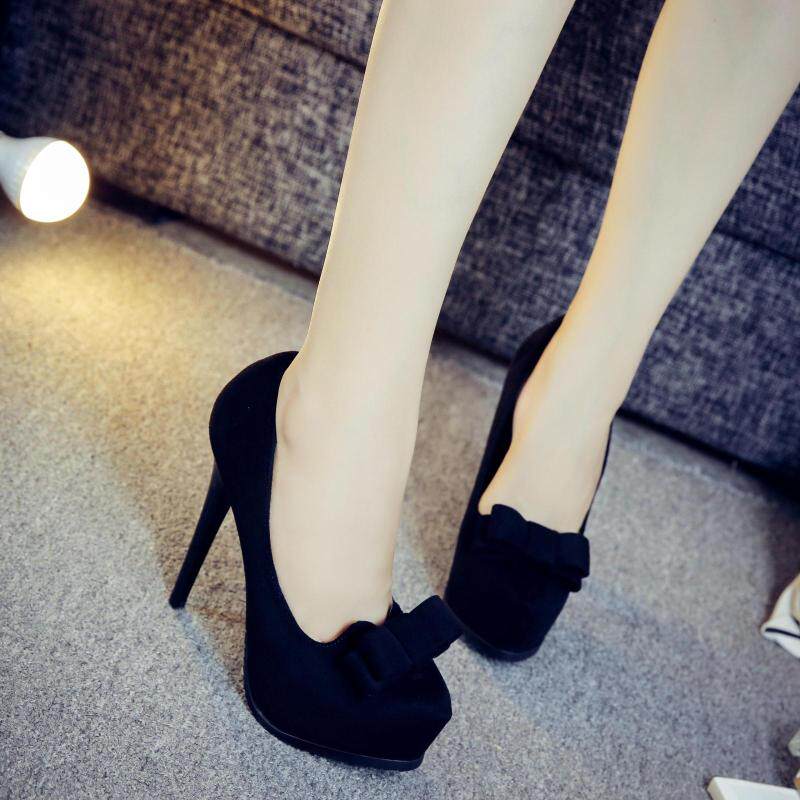 12cm超高跟鱼嘴鞋细跟绒面舒适高跟单鞋蝴蝶结黑色工作鞋女