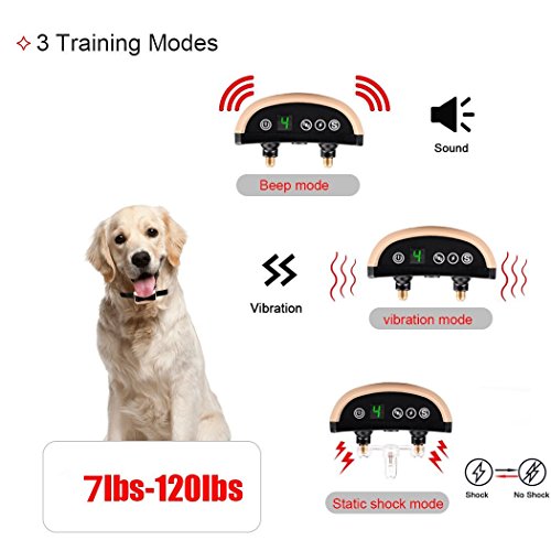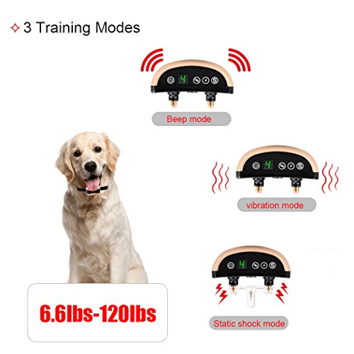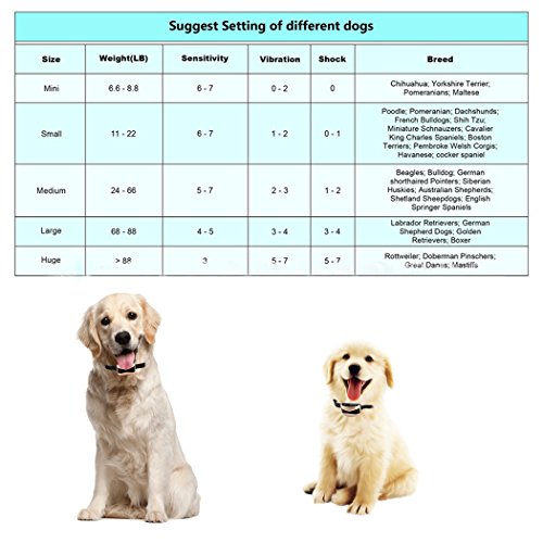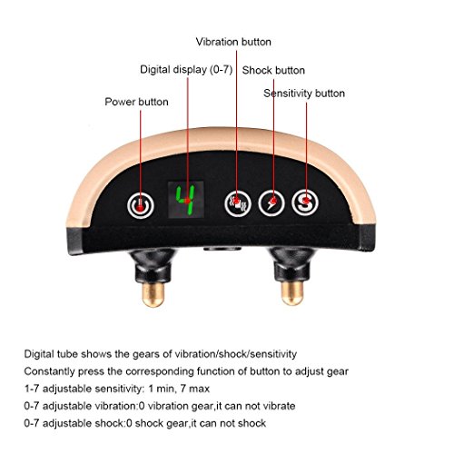 LCD screen When charging, the digital tube of bark collar will display the power and continue to flas Large capacity battery - Full charging takes 1 hour,and then can last for 14 days. 7 gear sensitivity adjustment - when the vibration gear is 0, the product can sound shock, when the shock grar is 0, the product can sound vibration, when the vibration and shock are not 0, The bark collar will be the first sound then after the shock IPX3 waterproof - The anti bark collar allows dogs to wear in the rain. But take off your collar before taking a bath or swim to avoid additional damage Low voltage - The general safe voltage in 39V, training dog device voltage is only 3.7V, like static as short, to ensure the safety of the dog itself Auto-protection mode - If the bark collar keep activates for 7 times in 1minute,it will enter auto-protection mode. The display will flash 7 times. In the automatic protection mode, press any button to allow the product tp re-enter the work mode