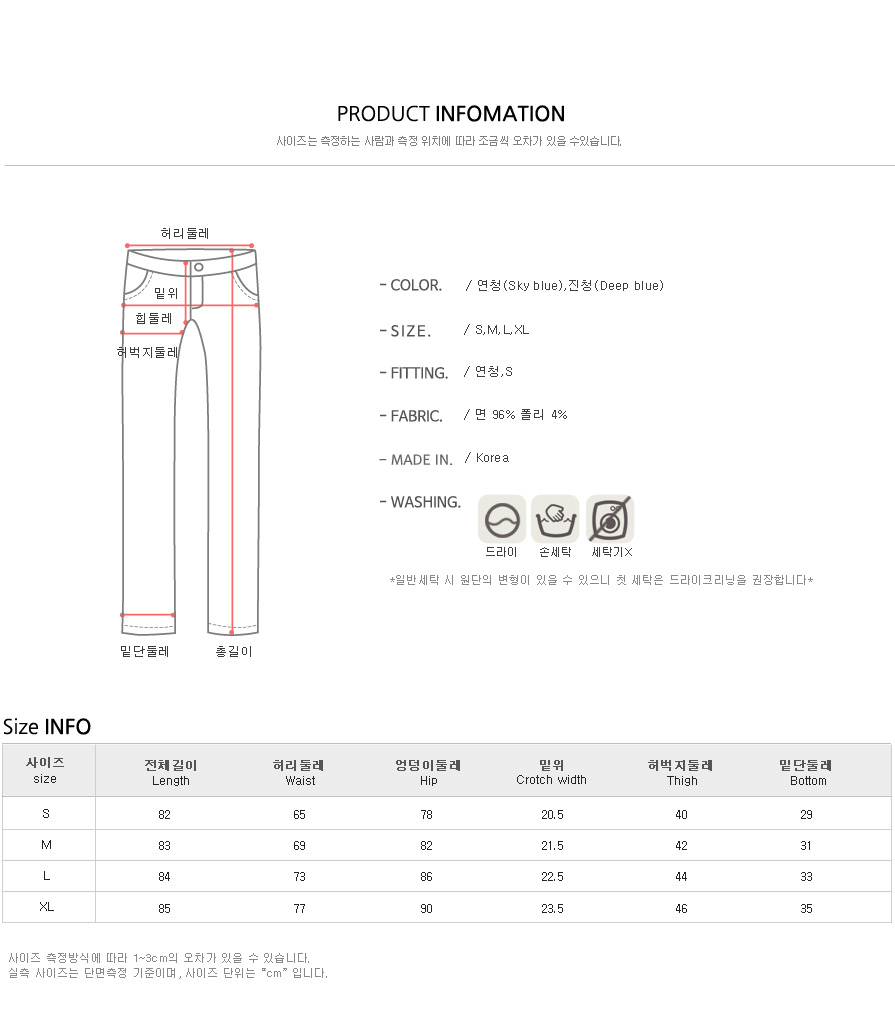 연청,진청 2컬러와 S,M,L,XL 까지 폭넓은 사이즈 준비완료:)