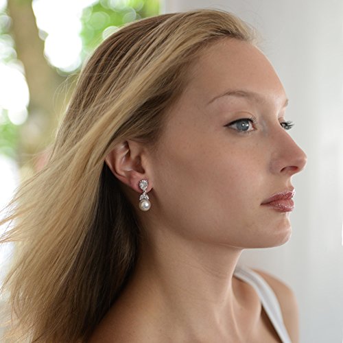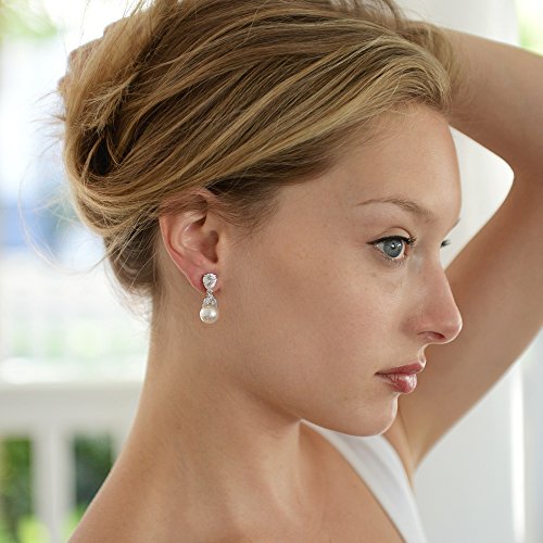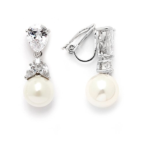 Mariell's top-selling Clip-on pearl wedding earrings feature brilliant pear-shaped cubic zirconia pronged stones resting atop lustrous 6mm round soft ivory pearl drops. Our 1" h x 1/4" w wedding dangles are the perfect size at the perfect price! Genuine Silver Platinum Rhodium plating and AAAAA CZ gems guarantee the look of fine jewelry to make an unforgettable statement on your special day. After your dressy frocks are neatly tucked back in the closet, wear these sophisticated clip on beauties with your business wardrobe or jeans and a sweater. We can't resist the dress up or dress down versatility of these pearl classics. Our non-pierced earrings have comfort cushion clip backs for all-day comfort. We promise you'll love these best-selling stunners or your money-back. Treat yourself or someone you love to some seriously gorgeous sparkle. Mariell's exclusive Risk Free purchase and Lifetime Guarantee.Feature