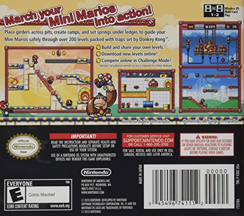-. Binding : Video Game -. Brand : Nintendo -. Color : One Color -. EAN : 0045496741129 -. Edition : Standard -. ESRBAgeRating : Everyone -. Feature : Participate in the all-new Challenge Mode where you will create a level based on certain criteria. Players can vote for their favorites and the top rated levels will be announced. / Use your stylus to strategically place items and solve different puzzles. Once you tap the Mini Marios, be ready to react quickly to help guide them safely to the exit. / Access the in-game Help Mode that lets you get more information on key items. Additionally, if players get stuck trying to solve a level, they can now use the new Mini Guide to demonstrate a possible solution. / Construct your own levels with an easy-to-use level building tool. You are also able to share your new levels with friends over local wireless or post them online using the Nintendo Wi-Fi Connection. / Access new levels created by fellow users with the Nintendo Wi-Fi Connection. Store up to 160 additional puzzles to always take the action with you, wherever you go. -. Genre : adventure-game-genre -. HardwarePlatform : Nintendo DS -. IsAutographed : 0 -. IsEligibleForTradeIn : 1 -. IsMemorabilia : 0 -. Label : Nintendo -. Manufacturer : Nintendo -. Model : 045496741129 -. MPN : 045496741129 -. NumberOfDiscs : 1 -. NumberOfItems : 1 -. OperatingSystem : nintendo_ds -. PackageQuantity : 1 -. PartNumber : 045496741129 -. Platform : Nintendo DS -. ProductGroup : Video Games -. ProductTypeName : CONSOLE_VIDEO_GAMES -. PublicationDate : 2010-10-31 -. Publisher : Nintendo -. ReleaseDate : 2010-11-14 -. Size : One Size -. Studio : Nintendo -. Title : Mario vs. Donkey Kong Mini-Land Mayhem! -. UPC : 045496741129