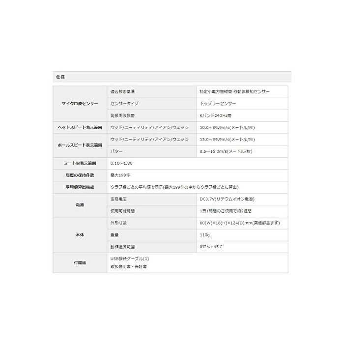 볼 스피드 표시 범위:드라이버 유틸리티 아이언 웨지(wedge):15.0m/s~99.9m/s(미터/초) 퍼터:0.5~15.0m/s(미터/초)
