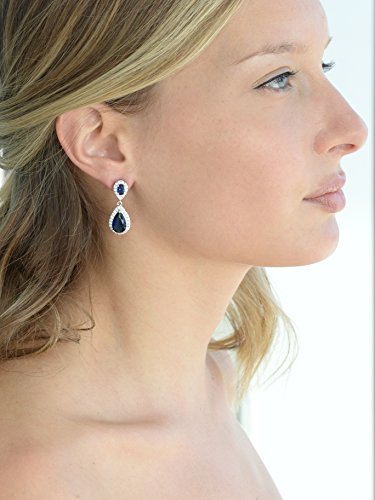 All eyes will be on you as you make your grand entrance wearing these stunning Sapphire Blue Cubic Zirconia teardrop earrings. Inspired by Royal weddings - these gleaming gemstone earrings make a breathtaking "Something Blue" to complete your bridal wardrobe with regal glam! These top-selling Sapphire earrings boast the much-loved September birthstone perfect for birthday gift-giving. Right off the couture runway, our 1 1/4" h glistening teardrop dangle earrings are the perfect medium sized earrings for your wedding or bridal gown, cocktail dress or any special occasion frock - they're not too big and not too small. Understated glamour at its finest. Dress up your business attire with an unexpected splash of Deep Royal gems framed in gleaming pave cubic zirconium. Wear these dangles with jeans and a sweater to add a splash of glam to your everyday wardrobe. With the brilliance and meticulous craftsmanship of fine jewelry, no one but you will know these head-turning affordable gems are not diamonds and genuine sapphires. Create a total ensemble and add our matching Mariell Designs 4036N-SA. This pendant is also an ideal gift for anniversaries, holidays, Valentine's day, bridesmaids and mother of the bride. We promise you'll love these glamorous dangles or your money-back. Treat yourself or someone you love to some seriously gorgeous sparkle. AAAAA Quality Cubic Zirconia, Genuine Silver Platinum Plating, and Lifetime Guarantee.Feature