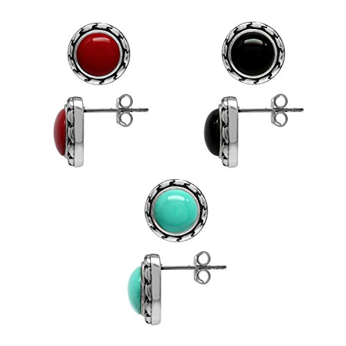 8MM 3-Pair Set Created Red Coral, Black Onyx & Turquoise 925 Sterling Silver Stud/Post Earrings