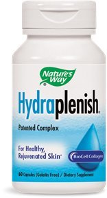 Natures Way Hydraplenish 60 Capsules. Pack of 3 bottles. Hydraplenish contains the patented BioCell Collagen complex for healthy connective tissue and skin. Hyaluronic acid is a "gelatin-like" fluid that acts as a natural lubricant within the body. It's an important part of healthy connective tissue and skin.Feature