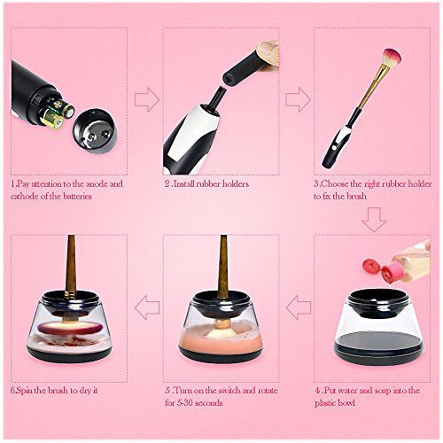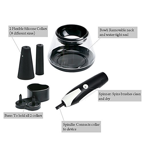 - EASY TO USE- JUST 4 STEPS: 1. Choose the right flexible silicone collar to fix the brush; 2. Put water & soap into the plastic bowl; 3. Dip and dunk the brush into soap water, turn on the switch for 5-30 seconds; 4. Spin the brush to dry it.