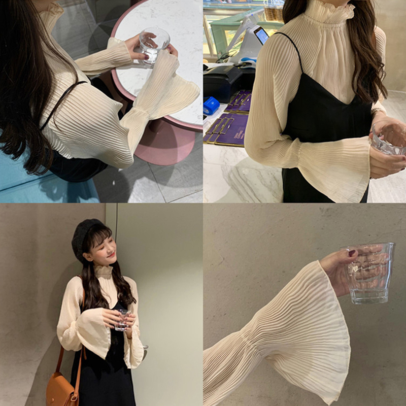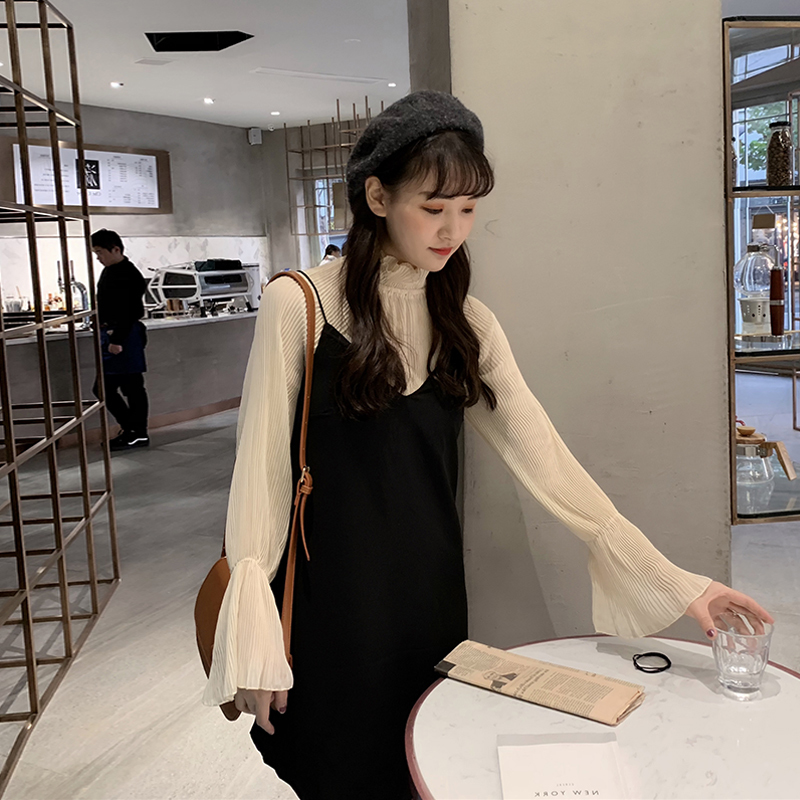 プリーツブラウス ハイネック フレア袖 キャミソールワンピース つりワンピ 二点セット 春物