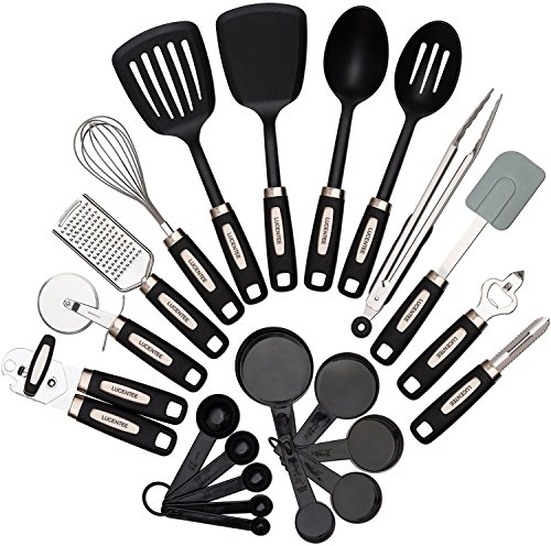 -. Feature : THE ULTIMATE KITCHEN ESSENTIALS STARTER SET - This Deluxe Set consists of: Stainless Steel Tongs, Stainless Steel Whisk, Bottle Opener, Can Opener, Potato / Vegetable Peeler, Pizza Cutter, Cheese Grater, Slotted Nylon Turner, Non-Slotted Nylon Turner, Slotted Spoon, Serving / Basting Spoon, 5 x Plastic (PP) Measuring Cups (1 Cup, ½ Cup, ⅓ Cup, ¼ Cup, ⅛ Cup), 5 x Plastic Measuring Spoons (1 tbsp, ½ tbsp, 1 tsp, ½ tsp, ¼ tsp) and One Silicone Spatula. / FEATURES - This Lucentee utensil set is made from durable but flexible nylon and premium stainless steel, plus BPA-free plastic (PP) measuring cups & spoons and a silicone spoon spatula. The beautiful nylon grips and large handles throughout this kitchenware set ensure easy grip and maximum control whilst cooking. Not only are these utensils heat resistant up to 450°F, they are dishwasher safe and super easy to clean too! Safe to use with all non-stick cookware & bakeware. / EXTRA FEATURES - This popular utensil kit is a must have for budding cooks and chefs of any skill level. As well as being designed for durability and longevity it is FDA Approved and has an attractive black and silver color scheme. Each utensil has a useful hanger hole in its handle to allow for storage on a rack or hooks. This set is a great option if you're looking for Christmas (Xmas) presents for friends and family, gifts for new homeowners and students, or just to treat yourself! / THE ULTIMATE KITCHEN STARTER SET - 22 high quality kitchen utensils that offer you everything, without costing you a fortune buying each piece individually. Designed to help with all your food preparation and cooking tasks including whisking, peeling, cutting, stirring, mixing, basting, baking, grilling, frying and serving! Whether you need a turner for that burger, or serving spoon for dishing out that tasty stir fry without scratching your nonstick wok, this utensil set does it all! / FULL LUCENTEE WARRANTY - Our promise to you! If you are not satisfied with this Lucentee 22-Piece Kitchen Utensil Set, we will provide a FULL refund or replacement without any questions asked! This makes your purchase absolutely risk-free and you can enjoy testing out its quality and durability! Purchase this utensil set today while stocks last by clicking "Add to Cart" above.