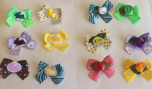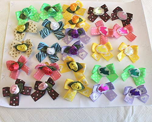 -. Binding : Misc. -. Brand : JJ Couture -. Color : Green Yellow Blue Pink Purple -. EAN : 0700220543324 -. Feature : Pack of 40 bows (20 different pairs) / Each bow is approximately 1.5 inches in size / Each bow has a base layer of grosgrain ribbon bow and the center layer of a Tulip or Bunny. / Great dog bows for the Easter season. -. Label : PET Expressions GA -. Manufacturer : PET Expressions GA -. NumberOfItems : 40 -. PackageQuantity : 40 -. ProductGroup : Pet Products -. ProductTypeName : PET_SUPPLIES -. Publisher : PET Expressions GA -. Size : s -. Studio : PET Expressions GA -. Title : Pack of 40 Easter 3D Dog Grooming Hair Bows with Tulips or Bunny -. UPC : 700220543324