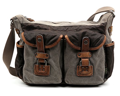 -. Feature : 100% cotton canvas and 100% genuine top skin leather. / Distressed design with heavy duty washed cotton canvas. Adjustable crossbody strap and Zipper closure, / Leather trim and pullers, Antiqued silver-tone hardware, Cotton webbing crossbody strap / Exterior: 2 slip pockets, zip pocket & 2 snap slip pockets, Interior: zip pocket & 2 slip pockets / 11''H x 13''W x 5''D, Approx. drop down length: 54''