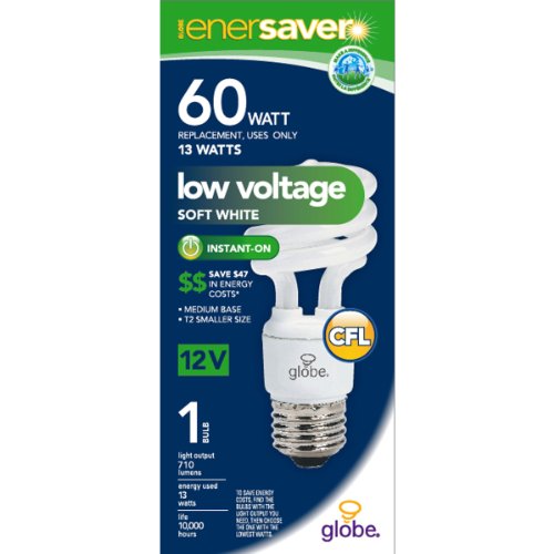 Studio : Globe Electric Publisher : Globe Electric Binding : Tools Home Improvement Product Description Globe Electric 13 watt Enersaver soft white, CFL medium base light bulb, 60 W equivalent. Light up your home with Globe Electric's 13 watt (60 Watt incandescent equivalent) compact fluorescent light bulb and save in energy costs. With a growing concern for reducing energy consumption, Globe's line of compact fluorescent lighting is widely growing in popularity. With compact fluorescent light bulbs, you can save money by switching from incandescent bulbs. CFL's use approximately 70% less energy than incandescent bulbs and produce the same light output. One CFL bulb lasts up to 12,000 hours. This saves you significant money in energy costs and bulb purchases. Brightness: 710 lumens, Estimated yearly energy cost (Based 3hrs/day, 11 KwH Cost depends on rates and use): 1.57, Life (Based on 3 hrs/day); 10,000 hrs, Energy Used; 13 watts. 0