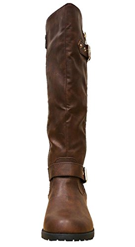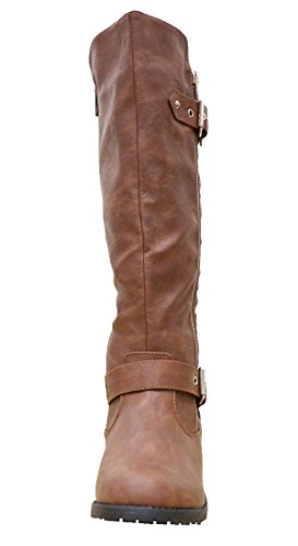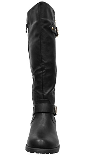 Product Description Cambridge select Women's knee-high riding boot features vegan-friendly leatherette throughout with side zip buckle closure faux buckle accents. Roudn toe front 1" flat heel. Imported. 0