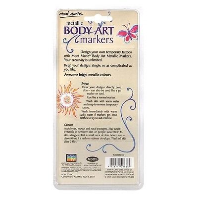 -. Binding : Toy -. Brand : Mont Marte -. EAN : 0780179035408 -. Feature : Metallic Body Art Markers -. Label : Mont Marte -. Manufacturer : Mont Marte -. PackageQuantity : 6 -. ProductGroup : Toy -. ProductTypeName : TOYS_AND_GAMES -. Publisher : Mont Marte -. Studio : Mont Marte -. Title : Mont Marte Metallic Body Art Markers - 6pce -. UPC : 780179035408