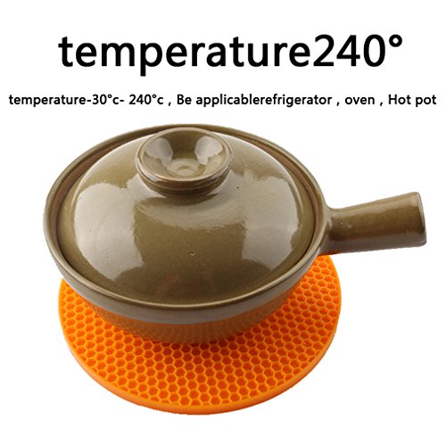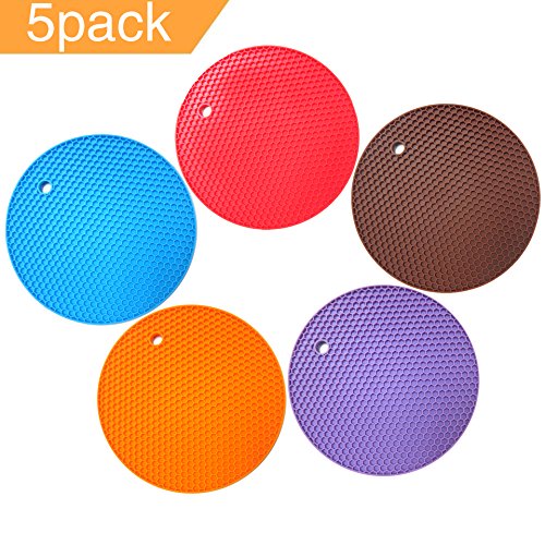 - ★Silicone Trivets Mats Set Specification: 5PCS thickened round cellular silicone placemat pot mat sets with 5 colors: Brown, Red, Orange, Light blue, Purple