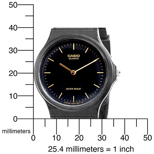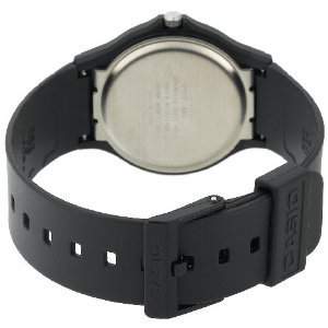 Amazon.com The basic black-and-gold design of the Casio Men's Analog Watch makes it a simple, versatile timepiece great for everyday wear. The watch is constructed with a resin case, a black stationary resin bezel, and a comfortable black rubber bracelet with an adjustable buckle clasp. A durable mineral window protects the black dial face, which cleanly features gold-tone hour indexes, gold-tone minute markers, and complementary watch hands. 0