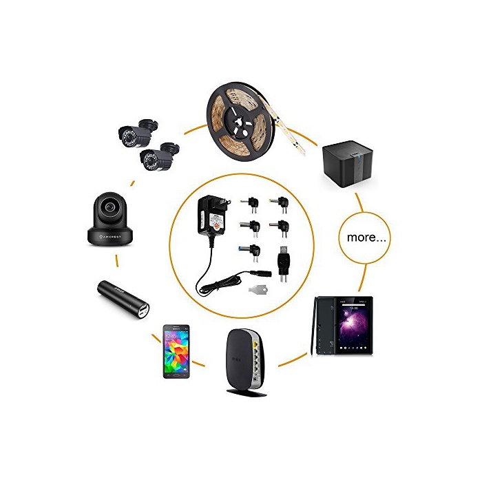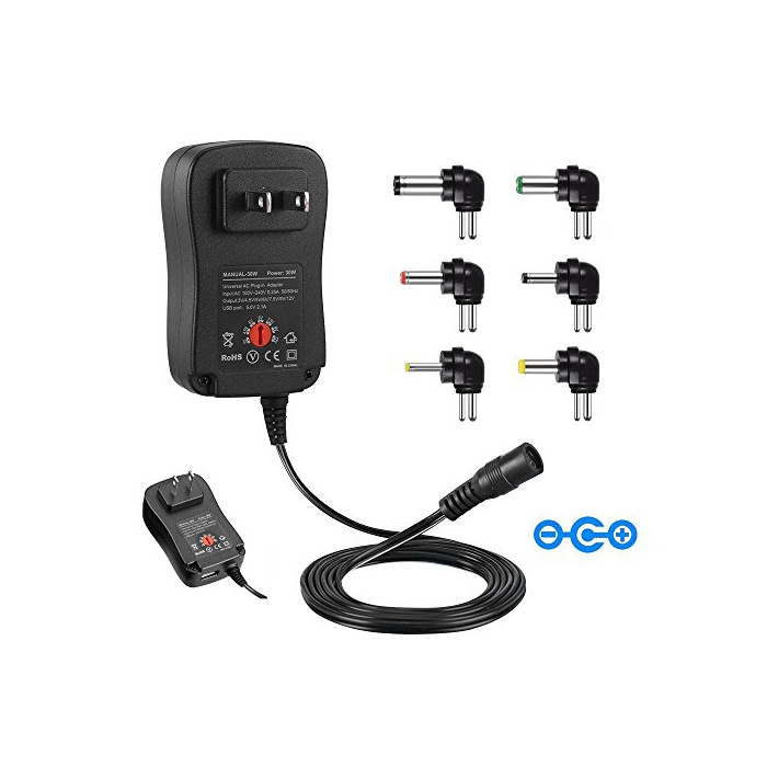 입력:100V-240V.출력:3V,4.5V,5V,6V,7.5V,9V,12V.소비전력:30W(최대).DC커넥터:5.5x2.5mm,5.5x2.1mm,4.0x1.7mm,3.5x1.35mm,2.5x0.7mm,3.0x1.1mm.USB포토:5V2.1A.대응 기기마다 다른 어댑터를 드는 필요는 없습니다.이6개의 Tips만 있으면,소지의 저 전력 전자 기기로도 거의 대응에서 옵니다.