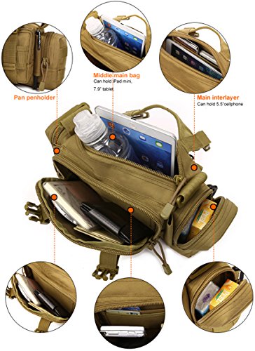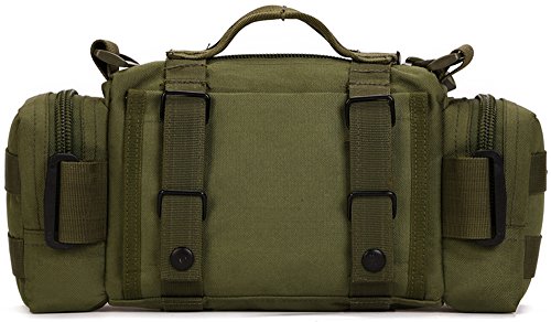 -. Feature : Handy ,4-Way Carry(Waist Pack, Shoulder bag, Chest back sling, Hand Carry) with Adjustable, Detachable Strap, small MOLLE pouch / Super versatile and multi-functional pack with 4 Zippered Compartments and Multiple pockets for Easy Organization of Gear / MOLLE integration at the back, easy to wear on belt or in combination with other backpack / Size: 12.6" x 5.9" x 3.9" (W x H x D); Weight: 1.3lb / Perfect for camping, hiking, cycling, military, outdoor, travel, trekking, and other outdoor activities