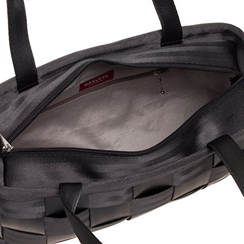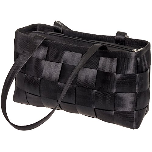 Hand woven and accented in seatbelt. Fully lined with inner zip pocket and extra slip pockets for storage. Features top carry handles and zip top.