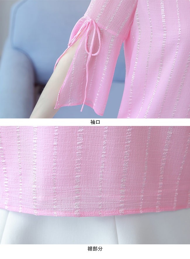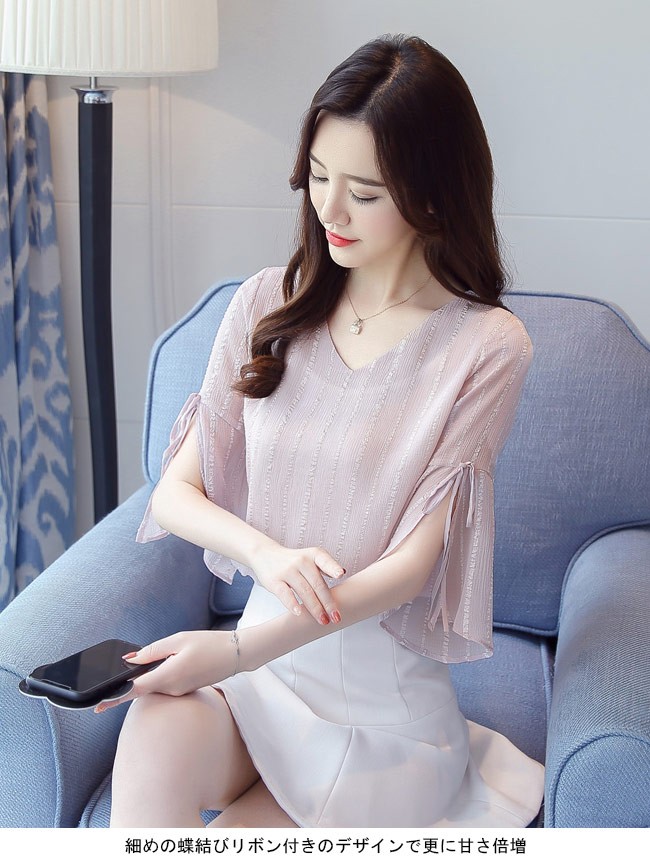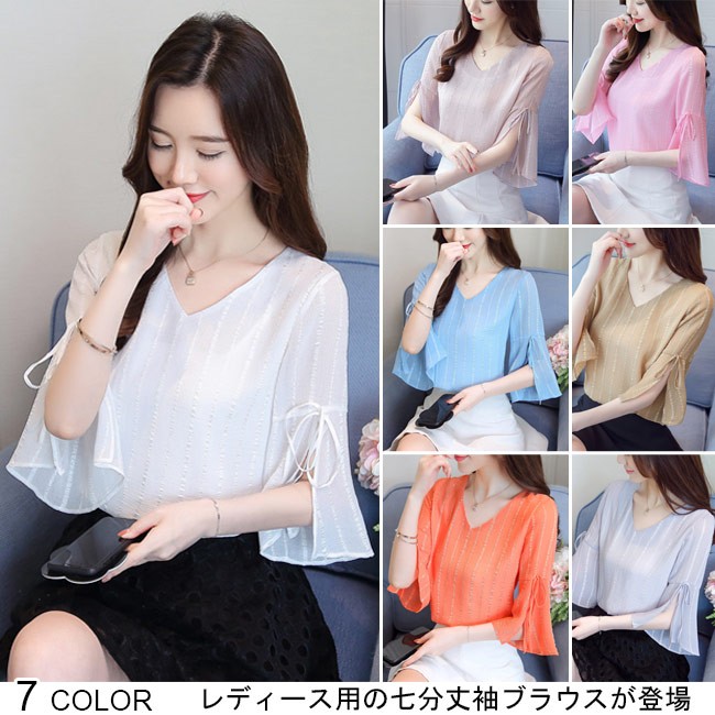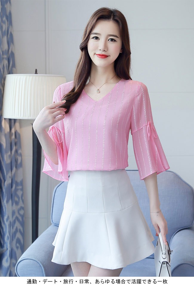| 商品名 | レディース ブラウス 七分丈袖 Vネック ストライプ柄 レディース シャツ ベルスリーブ リボン付き ゆったり 女性用 夏物 トップス 春秋物 |