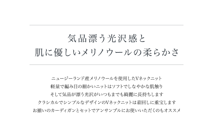 | 商品詳細 | JOHN SMEDLEY ジョンスメドレー ブランドの歴史 ジョン・スメドレー氏により1784年にイギリス ダビーシャー州マトロックのリーミルズに設立されました。 設立当初は綿花の紡績と生地造りに専念していましたが、18世紀終わり頃から編み物や靴下製造まで幅広く手掛けるように。 創業者でさるジョン・スメドレー氏の家系の人間が事業を引き継ぎ、今でも伝統的な製法を代々受け継がれています。 製品への拘り 創業当初より変わらぬダビーシャー州の工場にて、最新の技術と何世代にも渡って 伝承されてきた職人の技術の融合により生産されています。 他社では真似の出来ない工程で、超軽量で編み目の細かいニットの生産を実現させています。 ボディ部分と袖の縫い目に関しては、全て手作業で一針一針繋ぎ合わされています。 編みあがった製品は、マットロック地区の豊かな水源の水を使用し、洗浄されています。 独特の風合いを生み出す上で重要な工程となります。 素材への拘り ジョンスメドレーのメリノウールは自社で牧場を保有し、羊たちにオリーブなどの体に優しい餌を与えとても大事に、大切に育てています。 最高品質のものを作りたいからこそ、素材から丁寧に拘っているのです。 シーアイランドコットン(海島綿)は綿の女王と呼ばれる、世界三大綿の1つです。 世界で最も優れた綿といわれカリブ海、西インド諸島の限られた島からしか産出されません。 シーアイランドコットンは世界の綿花生産量の0.001%しか生産されず、高級店などの一部でしか見かけることはありません。 繊維が長くて柔らかいのが特徴となっており、カシミアのように滑らかで、絹のようにつややかな上品な光沢を持っています。 他のどの綿よりも吸水性に富み軽くて強いのが魅力です。 Vネックセーター ORCHID 素肌に心地良い、柔らかなニット素材を使った長袖のVネックセーターです。 ほどよいVネックの開きが、デコルテラインをより美しく魅せてくれます。 肩の中ほどに切り替えを施し、美しいラインを表現しています。 軽くて薄い素材なのに暖かいのが特徴で、デザインが洗練されているので着やせして見えます。 着こなしやすく、ジャケットやコートのインにも最適。 さまざまなコーディネートに取り入れられ、秋冬の定番アイテムとして活躍します。 モデル:身長165cm(B:82cm×W:58cm×H:86cm) 着用サイズ:S | ||
