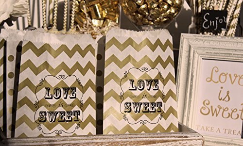 Bakers Bling Wedding Party Favor Bags with Stickers, Gold and White Chevron Stripe Love is Sweet Enjoy a Treat Candy Bags, 5.5 x 7.5, Set of 48 Bags and 48 Stickers