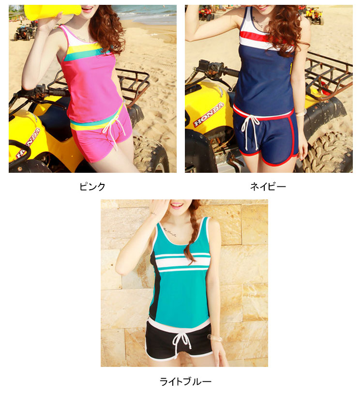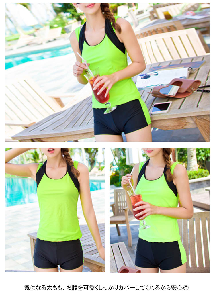 | 露出すぎないから始め水着を挑戦する方にも◎タンクトップデザインが露出が気になる方も挑戦しやすく、お洒落に着こなせます。気になる太もも、お腹を可愛くしっかりカバーしてくれるから安心◎パッド付きで胸もとをしっかりキープしてくれて、美デコルテをメイク♪ | |