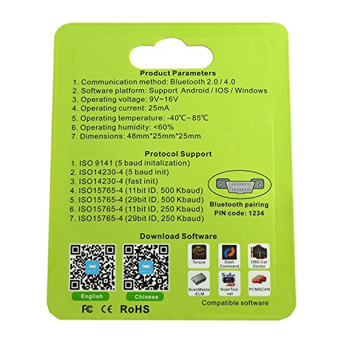 -. Feature : Read diagnostic trouble codes, both generic and manufacturer-specific, and display their meaning (over 3000 generic code definitions in the database). / Clear trouble codes and turn off the MIL ("Check Engine" light) / Display current sensor data,atigue driving alarm, overspeed alarm,Wate temperature alarm, intelligent driving,Vehicle examination , fault diagnosis,etc. / Compatible with IOS, Windows XP, Windows 7/8, Android, Symbian,Communication method: Bluetooth 2.0 / 4.0 / The world's smallest Mini OBDII V4.0L is designed with an advanced chip, with independent appearance of patents,utility model patents and software copyrights. Also, it's verified by the CE, FCC, RoHS certification.