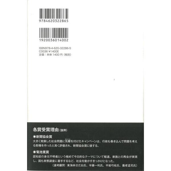 【商品説明】 定価(税込み):1,512円 値引き:10% OFF 2014年 新聞協会賞・菊池寛賞ダブル受賞! ! 「太郎」という仮名のまま施設で暮らしていた男性の家族との劇的な再会、 線路に迷い込み轢死した男性の家族にのしかかった巨額賠償請求・・・・・。 大反響を呼んだ、さまざまな人間ドラマとともに、「認知症のいま」をあぶり出し、 社会を動かした渾身のキャンペーンが一冊に。 バーゲンブック 新品 特価 格安 社会 社会問題 家族 男性 ドラマ | |