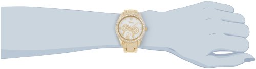 Great timepiece for Disney Mickey Mouse fans! This gold-tone bracelet watch features round case with clear rhinestone accented, genuine white Mother-Of-Pearl dial, Arabic number 12,3,9 and dots display and jewelry clasp. Cute rhinestone accented Mickey Mouse image on dial. It is also powered by quartz movement that tells you the accurate time. It is casual and fashionable that is nice for everyday wear.Feature