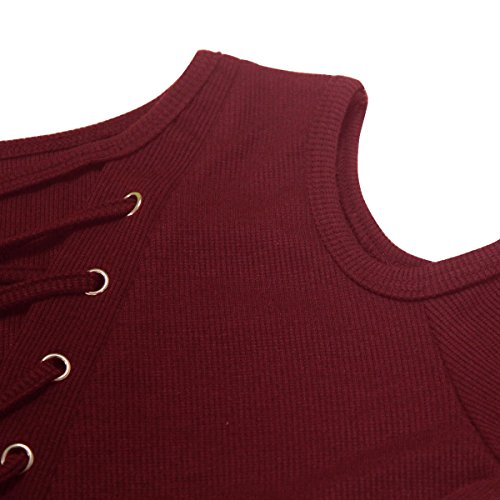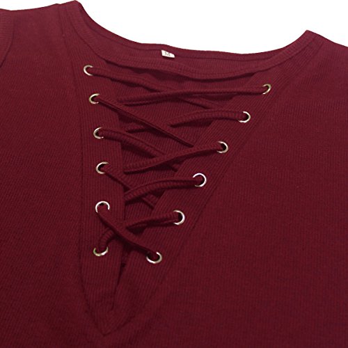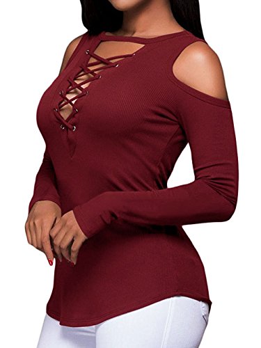 Lace Up, Plunging Neckline, Long Sleeve, Cold Shoulder, Off Shoulder, Solid Color, Sexy, Stretchy, Ribbed, Pullover, Shirts, Blouses, Women Tops
