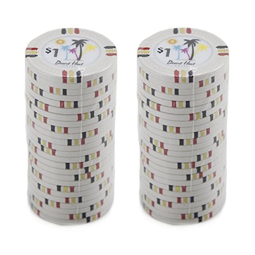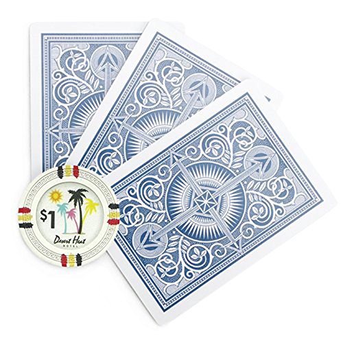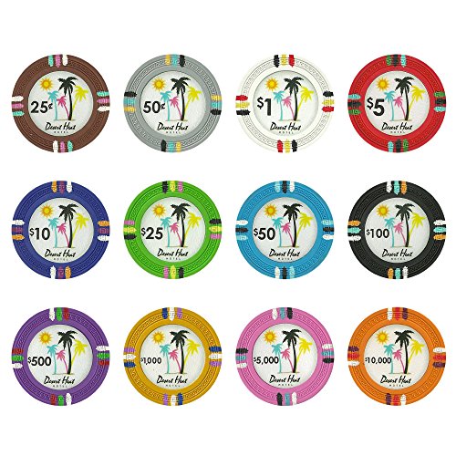 Lots of great details: Bright and bold chips with colorful stripes, a tropical inlay showcasing the fictitious Desert Heat Hotel & Casino, and a meander pattern, otherwise called “Greek Key,” around the outside of the chip