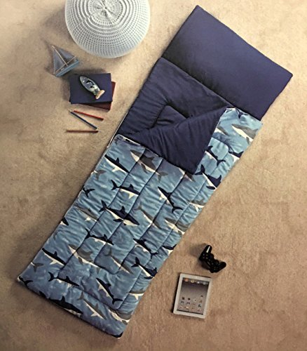 Product Description Slumber/Sleeping Bag from Standard Blues in an awesome "Happy Sharks" theme will bring your little guy hours of fun and happiness. Whether at a sleepover or just a fun night at home, your little one will love sleeping in this super cute slumber/sleeping bag! 0