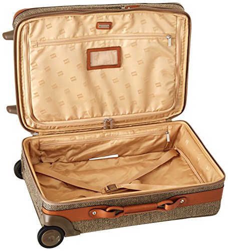 -. Feature : Leather trimmed carry straps, leather telescoping handle grip, heritage hartmann details. Dual mounted spinner wheels. Companion bag sleeve / Tsa lock or padlock with leather key fob. Protective bumpers. Dust bag or travel cover. 100% nylon tweed and full grain leather / Leather accented organization, technology pockets, zippered packing compartment / Protective lined travel pouch. Mesh garment hanger, cross straps, polyester twill jacquard lining / 21.5x14.5x10