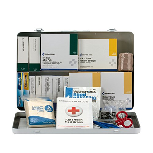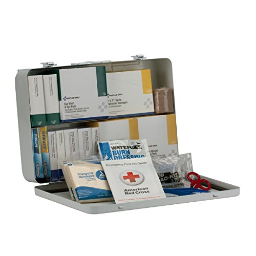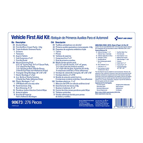 ReleaseDate : 2017-03-12 Studio : Pac-Kit Publisher : Pac-Kit Binding : Misc. Product Description 40) alcohol wipes (1) Scissors (1) tweezers (12) aspirin tablets (2) cold compress, 4" x 5" (1) first aid guide (20) burn cream packets (2) triangular sling/bandage, 40" x 40" x 56" (1) elastic bandage, 2" x 5yd (2) eyewash, 4oz and sterile eye cup (100) plastic bandages, 1" x 3" (1) CPR mask with one way Valve (10) hand sanitizer packets, 0.9G (1) burn dressing, 4" x 4" (10) Providence-Iodine wipes (12) antacid tablets (20) triple antibiotic ointment packets (2) 2 eye pads and 2 adhesive strips (4) Knuckle bandages (5) fingertip bandages (2) conforming Gauze roll, 4" (2) trauma pads, 5" x 9" (2) first aid tape, ½" x 5yd (12) Gauze pads, 4" x 4" (4) nitrile exam gloves. 0