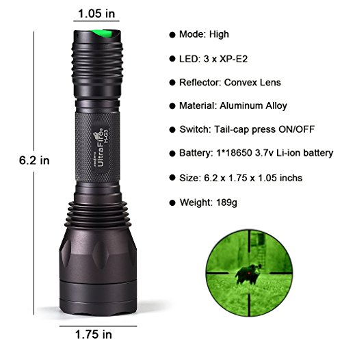 - Super bright green hunting flashlight, featuring 3 pcs the latest XP-E2 Green LED,Single mode green light design easy to use.