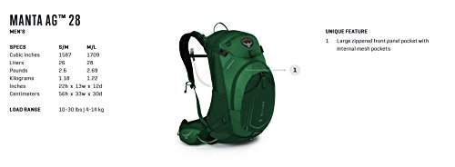 -. Binding : Sports -. Brand : Osprey -. Color : FOSSIL GRY -. Department : unisex-adult -. Feature : Osprey's stow-on-the-go trekking pole attachment is designed to quickly attach and carry trekking poles while wearing the pack / An integrated and removable rain cover protects your gear from foul weather. It stows away in its own external pocket at the bottom of the pack / Located just below the osprey logo near the top of the font panel, the helmet attachment loop keeps your helmet securely in place while Not in use / A large zippered front panel pocket contains internal mesh pockets for gear organization / The blinker light attachment found near the base of the front panel of the pack allows for Quick light attachment for high visibility in the dark / Pockets: 3 interior slip, 6 exterior -. Label : Osprey -. Manufacturer : Osprey -. Model : 10000196-P -. MPN : 1000095 -. NumberOfItems : 1 -. PackageQuantity : 1 -. PartNumber : 1000095 -. ProductGroup : Sports -. ProductTypeName : OUTDOOR_RECREATION_PRODUCT -. Publisher : Osprey -. Size : One Size -. Studio : Osprey -. Title : Osprey Packs Manta AG 28 Hydration Pack