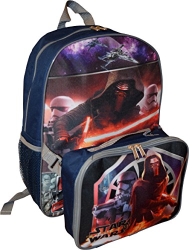 -. Brand : Disney -. Color : Navy-Grey -. Department : boys -. EAN : 0758576904504 -. Feature : Made of an easy to clean and very durable polyester / Includes one backpack with detachable heart shape lunch box / Backpack features one large zippered compartment for binder, books and folders & two net side pockets for bottles / Backpack with adjustable padded shoulder straps for additional comfort. Lunch box is easily strapped to the backpack / Backpack dimensions: 16"H x 12"W x 5"D. Lunch Box is 8""H x 10"W x 2.5"D -. ProductGroup : Apparel -. ProductTypeName : LAGE -. Size : Medium -. Title : Disney Star Wars 16" Backpack With Detachable Matching Lunch Box -. UPC : 758576904504