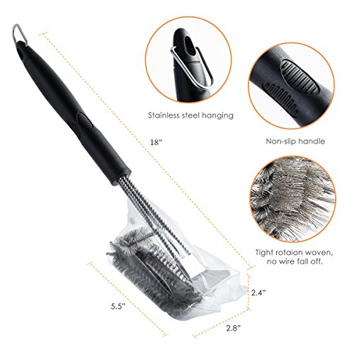 - 【THE IDEAL HANDLE】18” long grill brush keep your hand safe from the heat generated by the barbecue grill. High- quality and non-slip material ensure it will not fall or break even under the great pressure. Perfect angle between handle and bbq tray, easy for you to clean by applying less pressure, you will happy to see your grill become shining again so easy and quickly.
