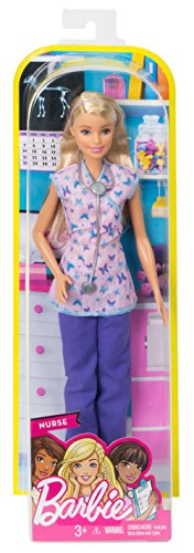 Dream big with Barbie career dolls! Barbie doll can take on any goal, and this nurse doll wants to ensure all her patients are healthy! Nurses are trained to care for patients and provide medical knowledge. Barbie nurse doll is ready to monitor her patients wearing a career-themed outfit complete with accessories that enhance storytelling. Barbie nurse doll is ready to care for patients in purple scrubs with a cute butterfly print top and purple shoes. Her long blonde hair hangs in a trendy straight style. And a silvery stethoscope helps give patients their checkups! Young minds will love exploring the world of nursing with Barbie nurse doll. Explore all of the Barbie career dolls because with Barbie, you can be anything (each sold separately, subject to availability). Includes nurse Barbie doll wearing fashions and accessories, plus stethoscope. Doll cannot stand alone. Colors and decorations may vary.Feature