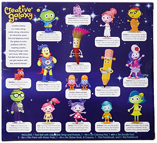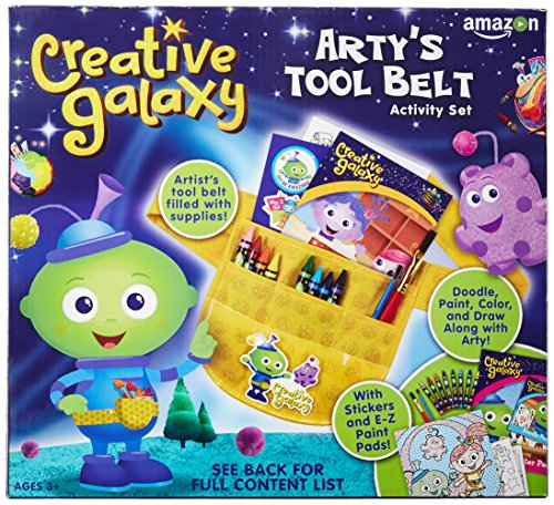 Get inspired with your very own Arty’s Tool Belt from the Amazon Original Series, Creative Galaxy. Create your own masterpieces with this colorful activity set that comes with 1 – 4" x 5" Coloring Pad, 1 – 4" x 5" Doodle Pad, 2 – 8" x 10" Paint with Water Pads, 1 – 4" x 5" Sticker Book, 8 Crayons, 1 – Thin Paintbrush, and 1 – Flat Paintbrush. The adjustable belt fits children U.S. sizes 2-8, with a waist size of 18"- 25". You’ll have everything an artist needs to go be amazing!Feature