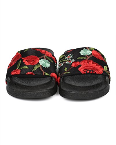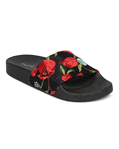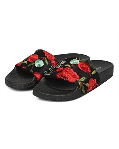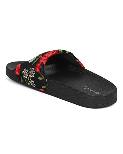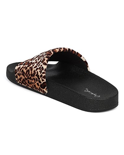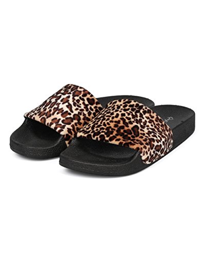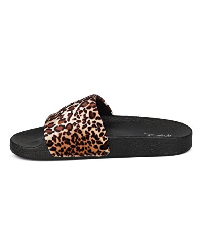 Product Description These slides are made with two different finishes, a black fabric floral embroidered finish, and a velvet leopard finish. Also designed with an open toe, single band and a molded footbed. 0