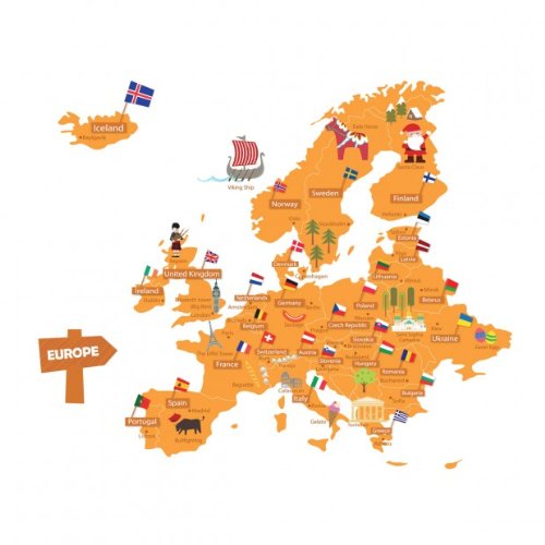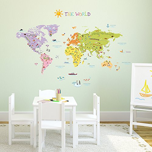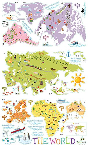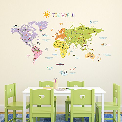 We have updated this excellent sticker set to a larger transparent film version and included many more countries of the world, flags, wonders of the world and landmarks making this the best quality kids educational world map you will find anywhere. Also included are ships, airplanes and fish so you and your child can add the finishing touches to customise this amazing design, and also we have included the sun, to complete this quality assortment of wall stickers.