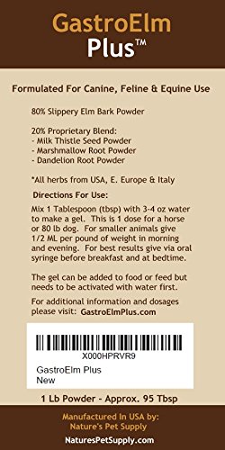 GastroElm Plus was intended for use with pancreatitis in dogs, ulcers in horses, as well as vomiting, diarrhea and other gastrointestinal problems in cats, dogs or horses. It is formulated and manufactured in the U.S. using the finest human grade herbs available.