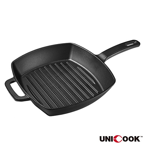 UNICOOK HEAVY DUTY CAST IRON SQUARE SKILLET, GRILL PAN, 10.25-INCH, GREAT FOR OVEN,GRILL,STOVETOP OR CAMPFIRE, EASY TO CLEAN, LAST A LIFETIME, BONUS OF A HEAT RESISTANT HOT HANDLE HOLDER